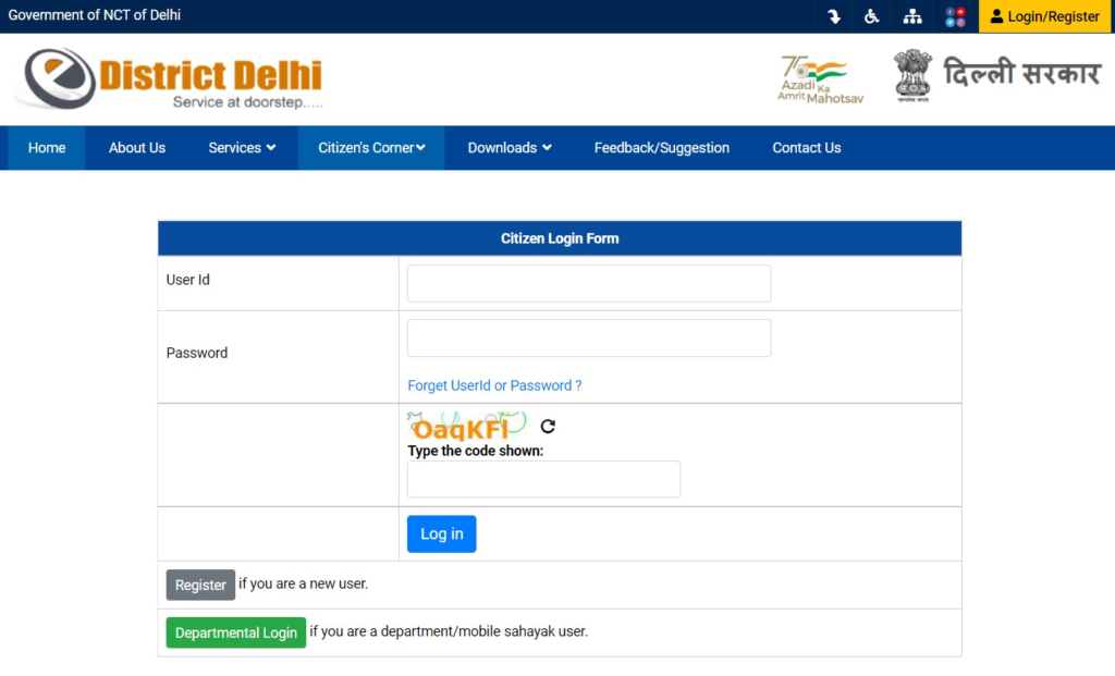 - Delhi Government के E-District Portal (edistrict.delhigovt.nic.in) पर जाएँ