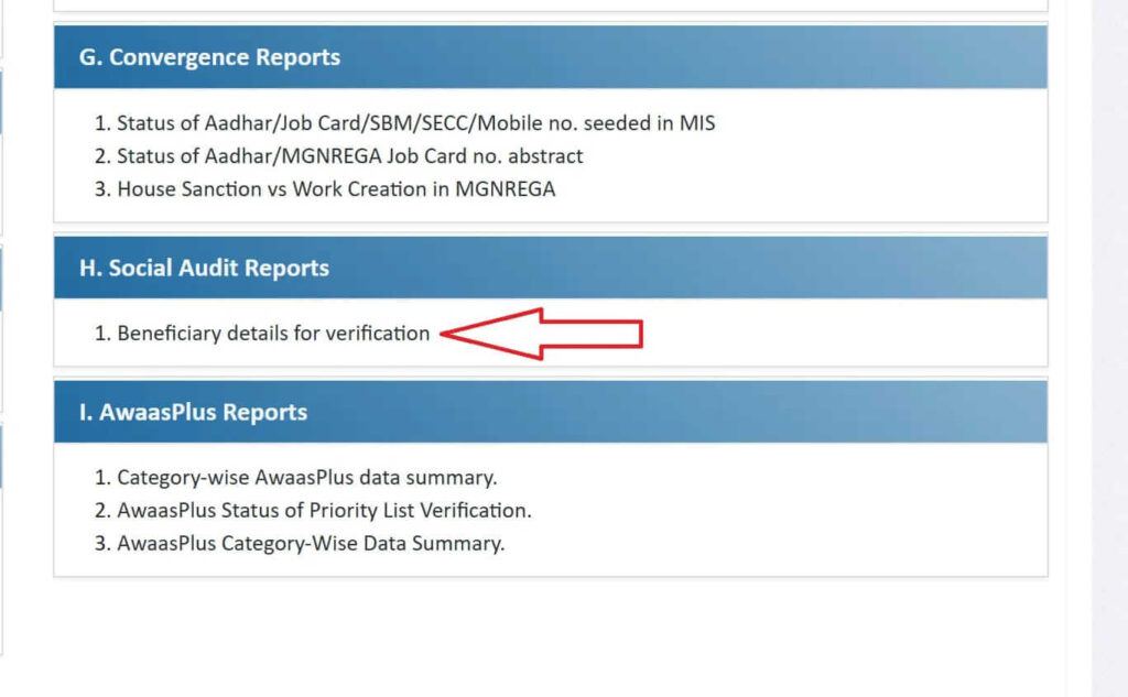 होमपेज खुलने के बाद मेन्यू में Awassoft विकल्प पर क्लिक करना होता है और फिर Report सेक्शन चुनना होता है। इसके बाद Social Audit Reports (H) सेक्शन में “Beneficiary details for verification” विकल्प पर क्लिक किया जाता है।